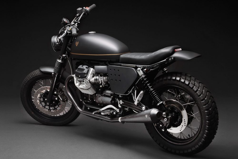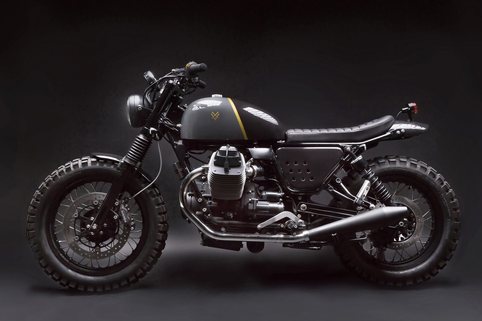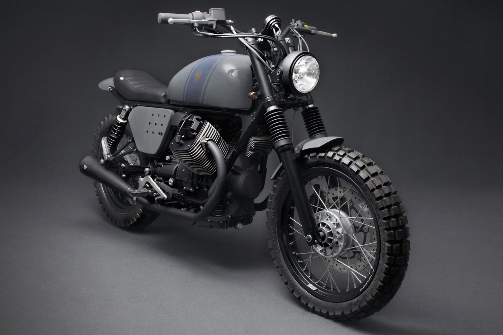 Impressive from top to bottom, the Tractor Motorbikes are the first Moto Guzzi Scrambler Venier made that boasts the new generation of hand crafted aluminium bodywork. The tank has been elongated and reshaped, and the tail section completely redone with a new hand made leather seat and a recessed LED tail light and new rear fender. These breathtaking bikes also have a 4”headlight with custom brackets, black aluminium handlebar, GPS custom speedo with Venier logo, new grips, custom mufflers have been made for the bike by Mass Moto in Sicily. Last but not least, you have the hand crafted aluminium sides and front fender which finish the bodywork off in style.
