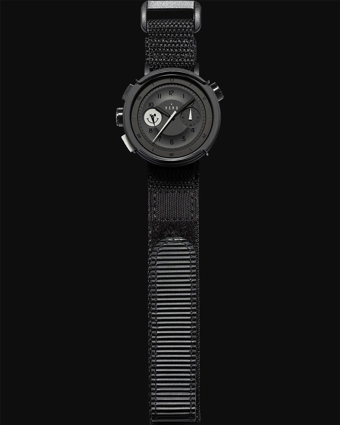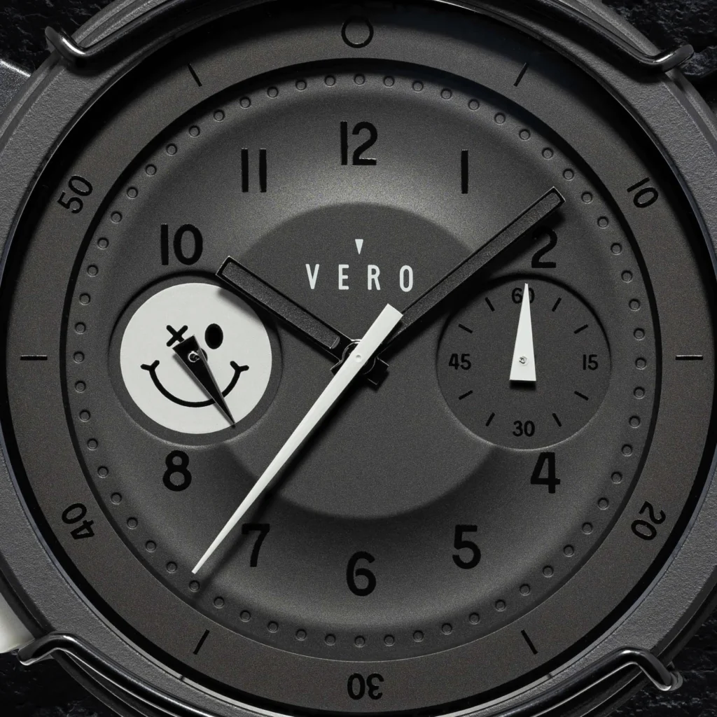 The aesthetic details make this watch a true standout. The minimal amount of lume on the hands ensures that the watch retains its stealthy look, with just enough visibility for night-time readability. The subtle light grey accents—on the lower push button, second and chronograph hands, and the Hooligan smiley—are the only hints of contrast, adding a touch of playfulness without taking away from the watch’s overall sleek, monochromatic appeal. The inner rotating bezel allows for quick adjustments, while the chronograph function, powered by the reliable Miyota 6S21 central quartz movement, keeps precise time with a quick reset feature for ease of use.