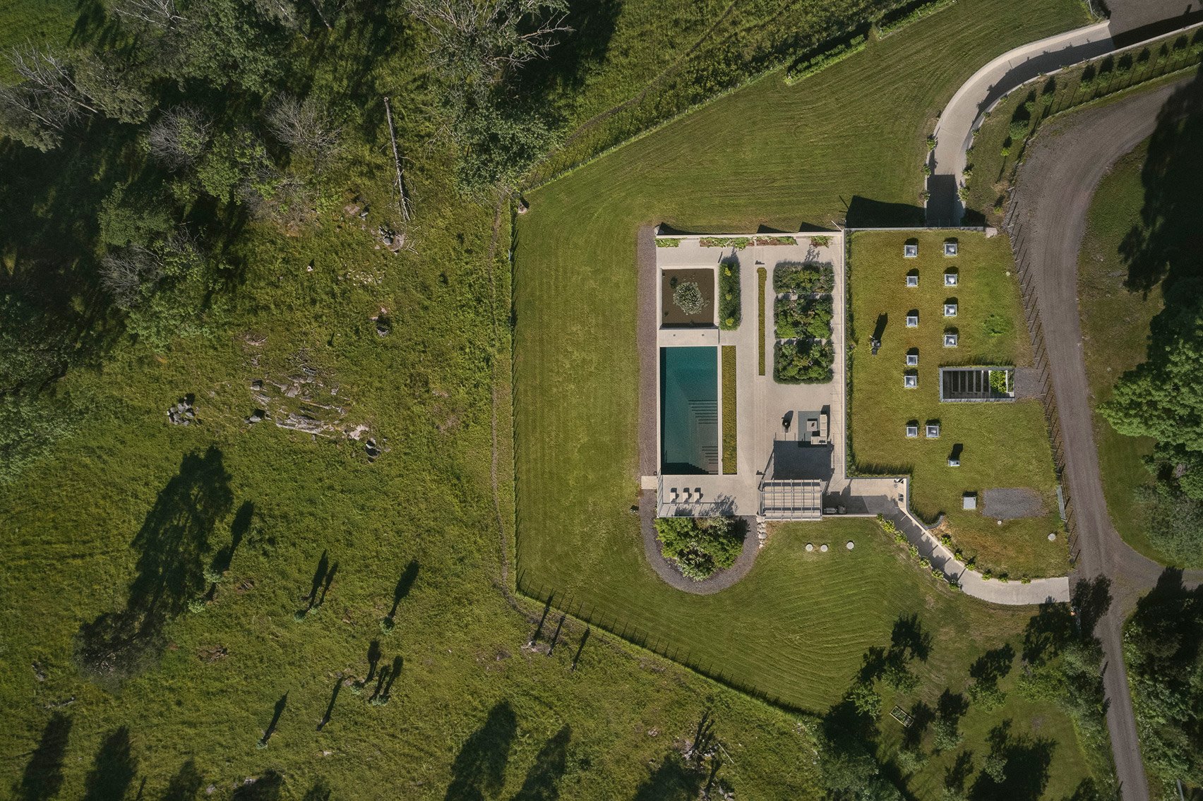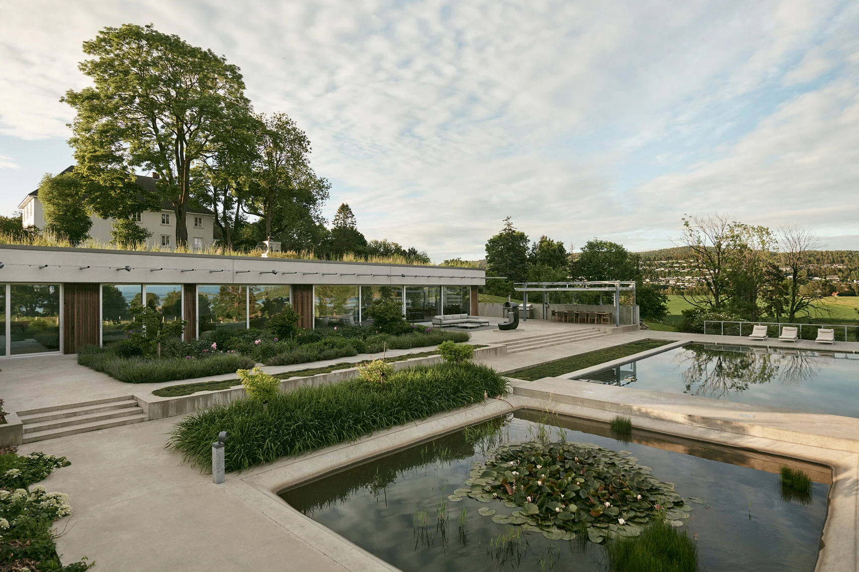 So as not to be too impactful on the glorious countryside, the architects sunk the 375-square-metre villa into a gentle slope on the site, which essentially hides it from view on approach under a green roof and they added a pair of stepped terraces on the opposite side of the property. A green roof on top of the villa acts itself as an upper terrace and a lower terrace and the eye-catching garden at Villa Aa includes two impressive water features.