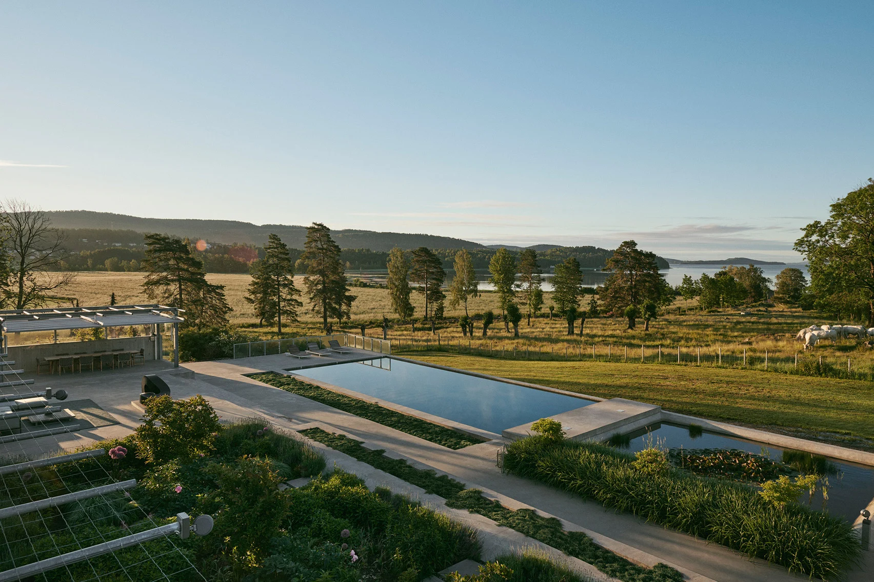 On the inside of Villa Aa, the layout and material treatments are divided into a darker and intimate subterranean section on the north side, and a more visually vibrant and exposed area to the south. In the brighter southern part of the villa there are the three main bedrooms and a living, dining and kitchen area, which are enclosed by glass sliding doors that open onto the terraces. With approximately double the footprint of Villa Aa’s interior, the terrace consists of an upper section with planted beds and seating areas, and a lower part where a rainwater pool and swimming pool evoke the water witnessed in the nearby fjord. A majestic piece of Scandinavian architecture that we’re loving here at The Coolector.