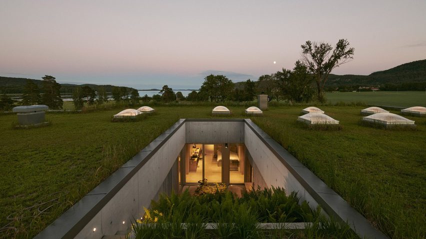 Named Villa Aa, the impressive project was designed for the family that owns the farm, who wanted a contemporary property and office while that manages to retain and respect the nature and protected status of the plot. To achieve this result, the architects opted for sinking the 375-square-metre villa into a gentle incline on the site, hiding it from view on approach under a green roof and creating a pair of stepped terraces on the opposite side.