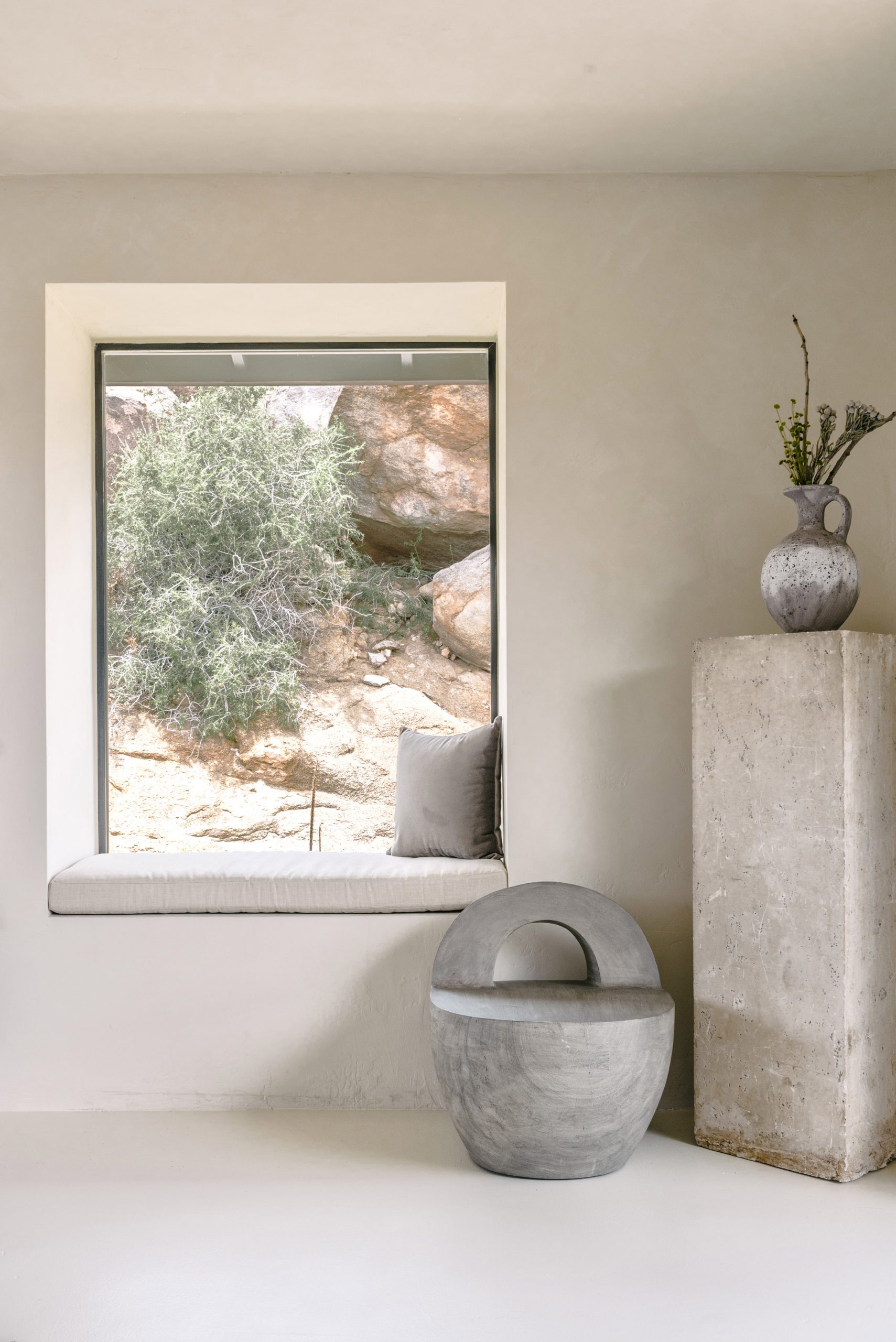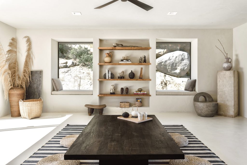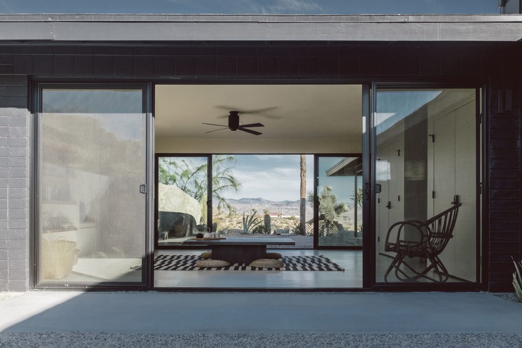Mini Inno added sliding glass doors to the garage of Villa Kuro in Joshua Tree National Park to deliver a light-filled tea room. Two nooks are built into the walls and boast breathtaking windows that frame nearby boulders. This visually impressive room is decorated with a low coffee table and woven floor cushions and it is often used for a spot of meditation such is the relaxing nature of the design.