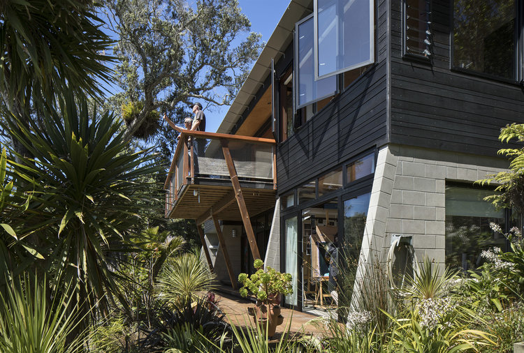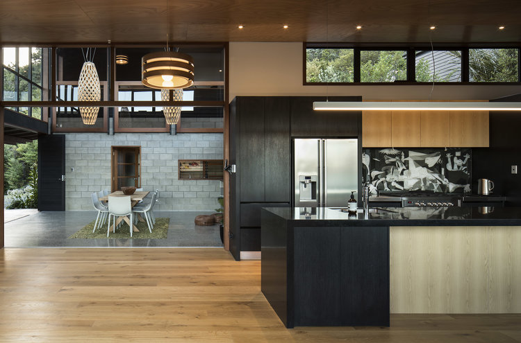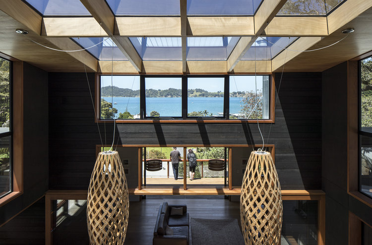 An open-plan atrium capitalises on the space between this living wing and the workshop with master suite above with stunning views out onto the bay achieved via the glazed roof and clerestory. This atrium area is a multi functioning space that provides the main access and its transparency gives a real sense of space to the building. Floor levels respond to the sloping site and are linked with a connecting glazed stair gallery, which was designed to be a nod to the original path which connected the old bach to the shared tennis court to the north of the structure.