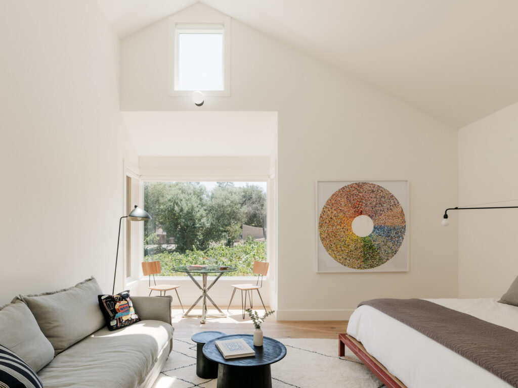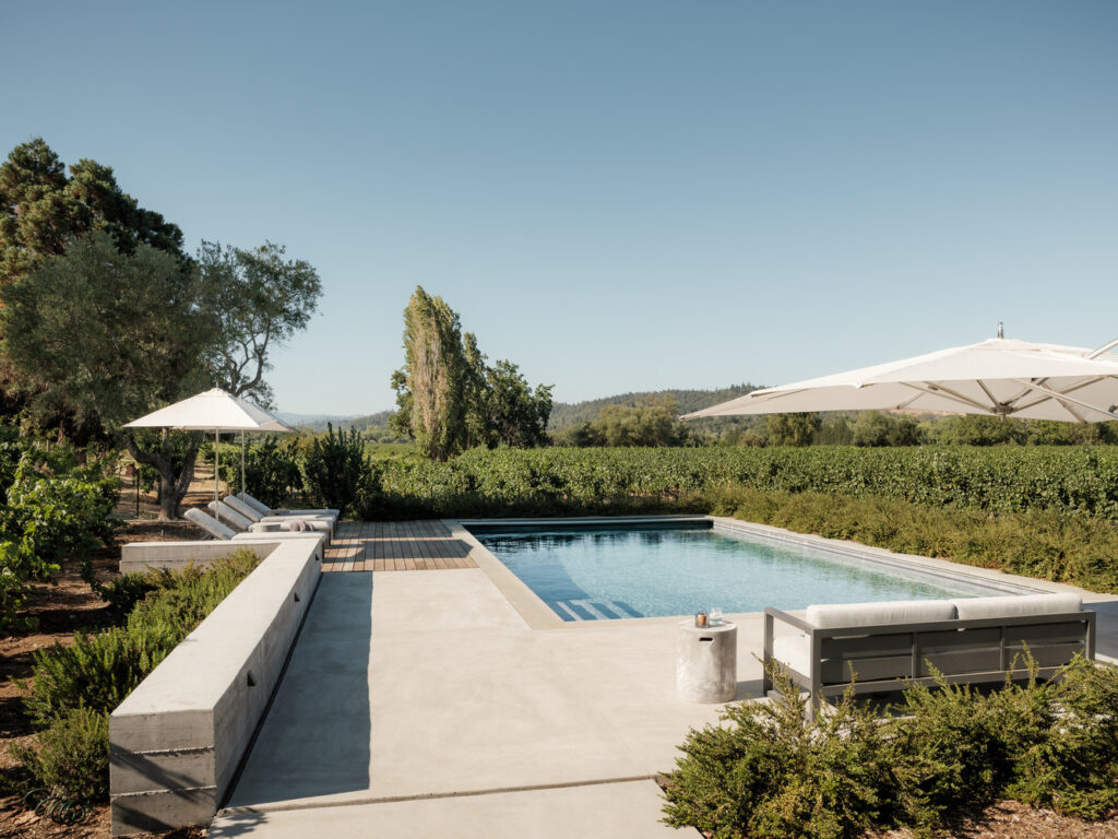 Malcolm Davis Architecture collaborated with the landscape design team, Lucas & Lucas, to seamlessly blend the new addition—a structure housing a guest suite, covered parking, and an outdoor kitchen and living space—into the lush estate. Their efforts ensured that the building harmoniously connected with the existing house and pool, creating a unified wine country complex accentuated by meticulous landscaping and deliberate sightlines.