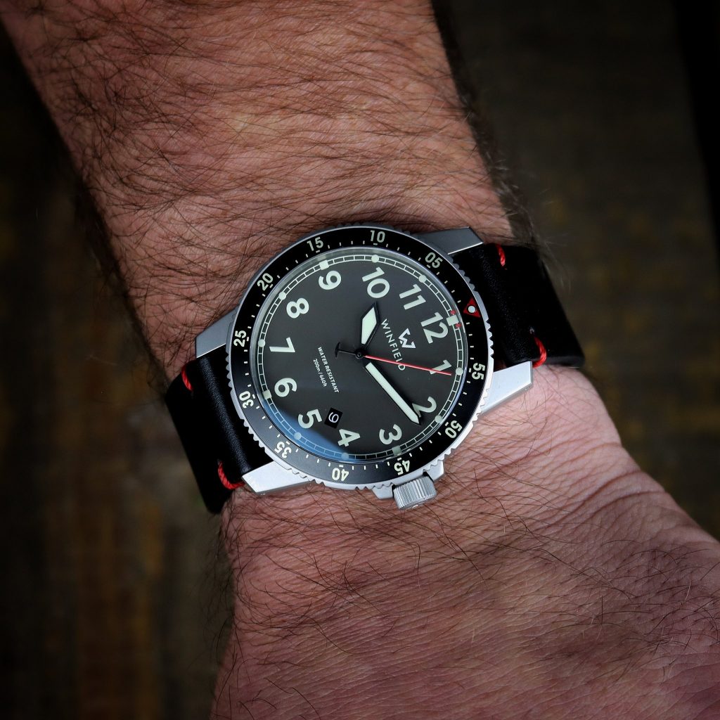 Priced at $399, the Winfield Mission Timer One Watch doesn’t break the bank but ensures you get a highly quality, adventure ready accessory on your wrist. The black dial and bezel of this timepiece have an understated look, which has been bought to life by a splash of colour. There are very minimal red highlights on the seconds hand and the 12:00 position on the dial which are well executed and stylish and adds a touch of class to proceedings.