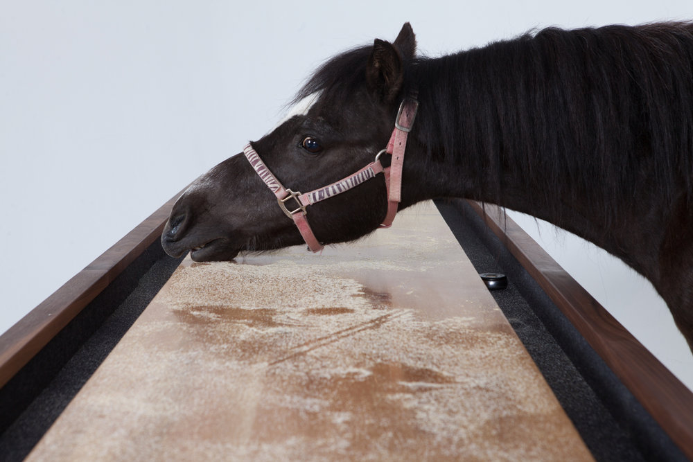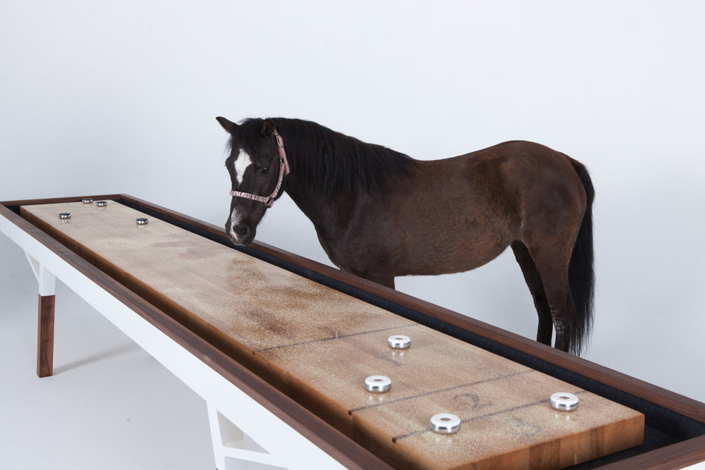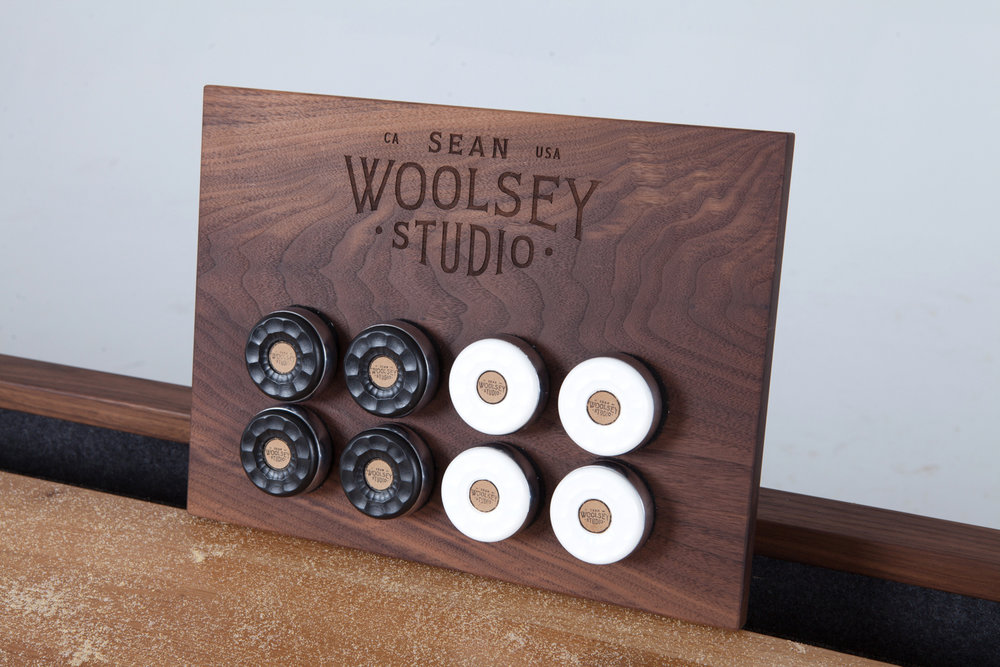 Each Woolsey Shuffleboard Table comes replete with four white and four black pucks (we’re not going to embarrass ourselves and pretend we know how to play), plenty of shuffleboard salt (aka wax, powder, sand) and, last but not least, a super cool looking magnetic wall mount to place the pucks when you’re not using them. Stylish and well crafted, this is a one might impressive piece of design once again from the Sean Woolsey Studio.