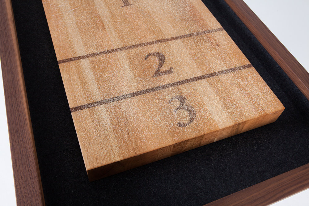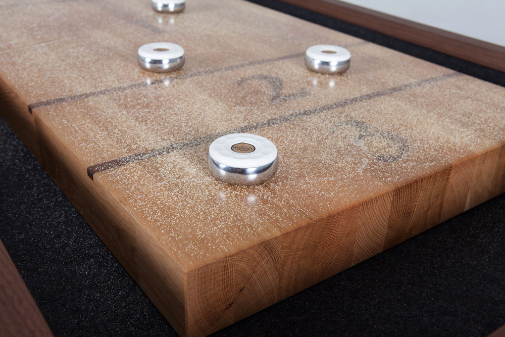 Quality materials and craftsmanship are part and parcel of the Sean Woolsey Studio and its no exception with the magnificent looking Woolsey Shuffleboard Table which exudes class. There are concealed levellers beneath the table to align and perfectly level out the shuffleboard if required. It delivers devilishly dapper solid black walnut legs alongside the steel frame and there is more of the stunning black walnut on the top of the table around the edge to give it that unparalleled aesthetic superiority.