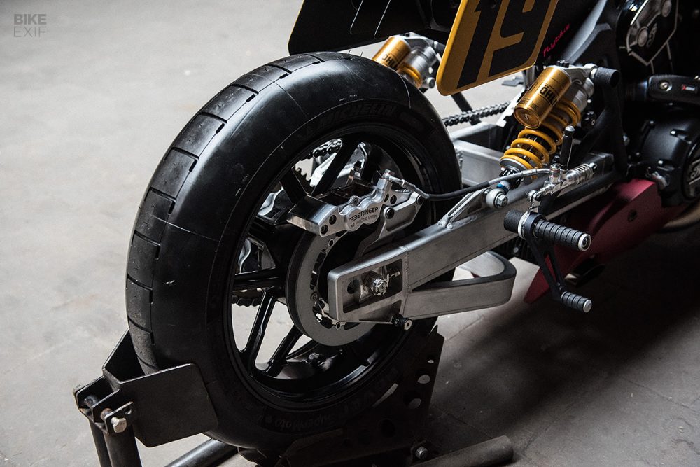 Everywhere you look with the Appaloosa there is a striking design detail to appreciate such as the use of quarter-turn fasteners throughout, so that bits of the fairing can come off quickly for maintenance. The fairing bracket is custom as well and consists of two parts with a new subframe, and new foot peg hangars too. Beringer provided the handlebar controls, and CNC machined a lot of smaller parts that Hennebert had designed.
