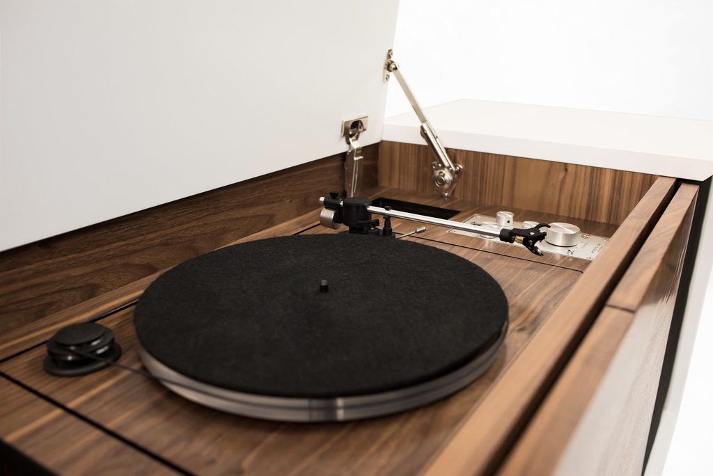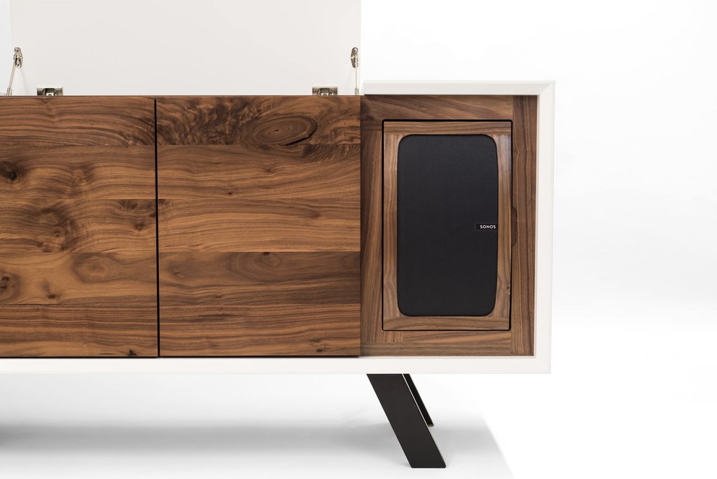 The first thing that stands out with the design of the Wrensilva Sonos Edition Console is the integrated turntable which has a 1 1/8″ constrained layer, split plinth construction and a Hurst 24v AC synchronous motor for a reliable performance – making this a vinyl lovers dream. The craftsmanship of the console itself is, as you would expect from Wrensilva, second to none and made from North American Walnut and white lacquer for a bold visual impact. With space for 120 records below the turntable, even a lofty vinyl collection will fit in this console and the LED lighted upper wood deck adds a nice finishing touch aesthetically.