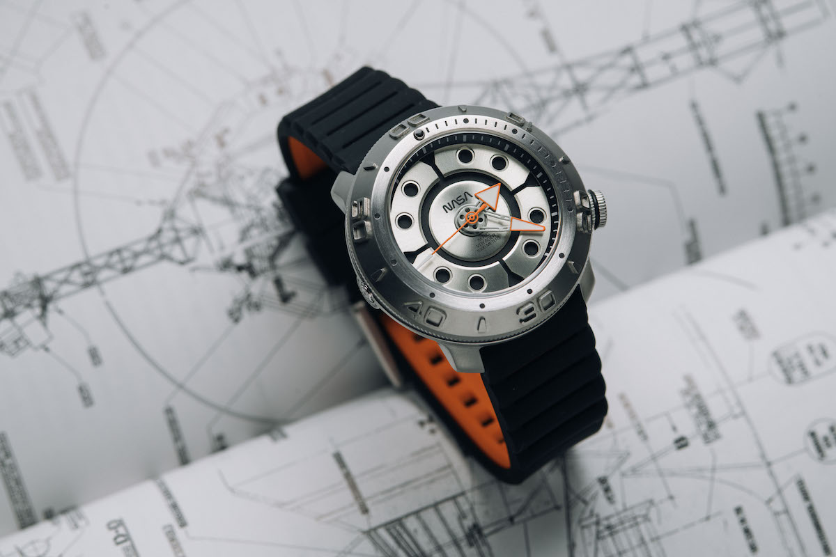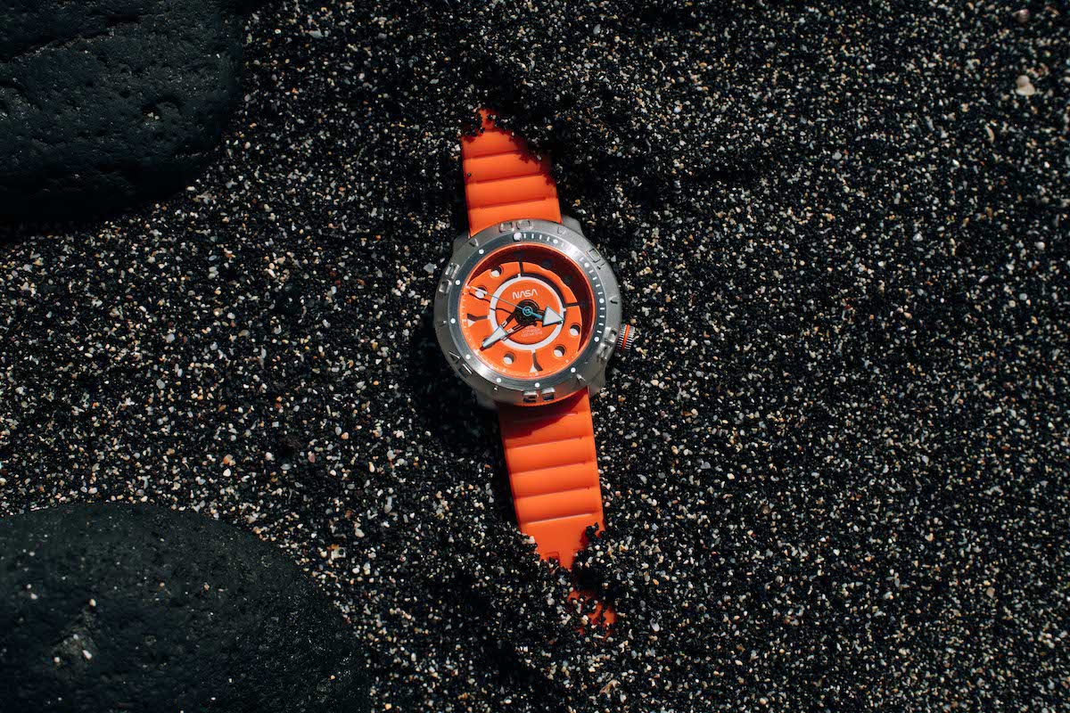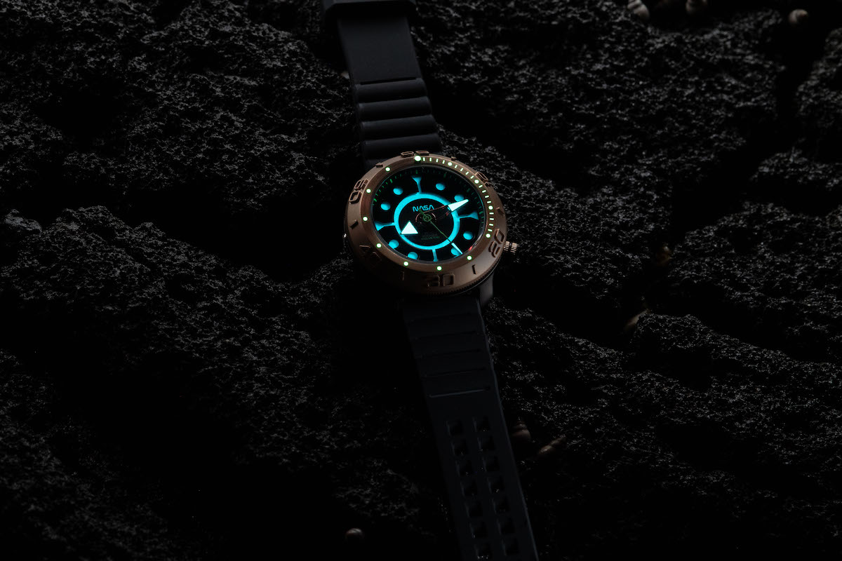 The dial of the timepiece features NASA’s iconic “worm” logo and a uniquely layered surface. A thick coating of Super-LumiNova has been applied to the hands and dial, which further enhances legibility in low light conditions. The watch dial is protected by an ultra scratch-resistant sapphire crystal and ready for any adventures you can think of. The watch is powered by the self-winding Seiko NH35 automatic movement which is both robust and reliable. As you wear it, the rotor winds the mainspring, creating stored mechanical energy that powers the watch.