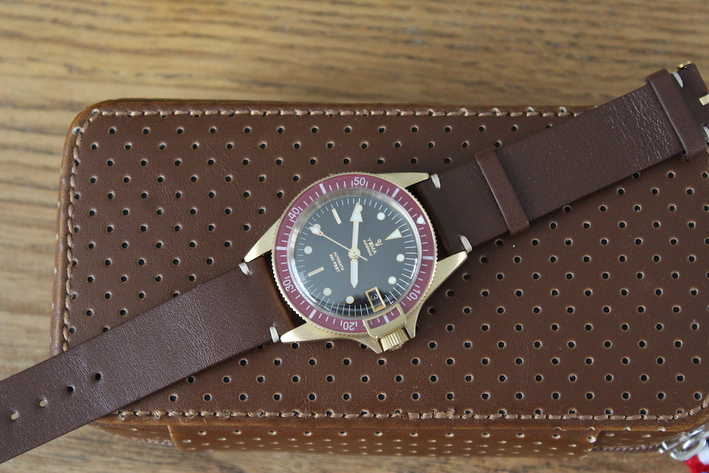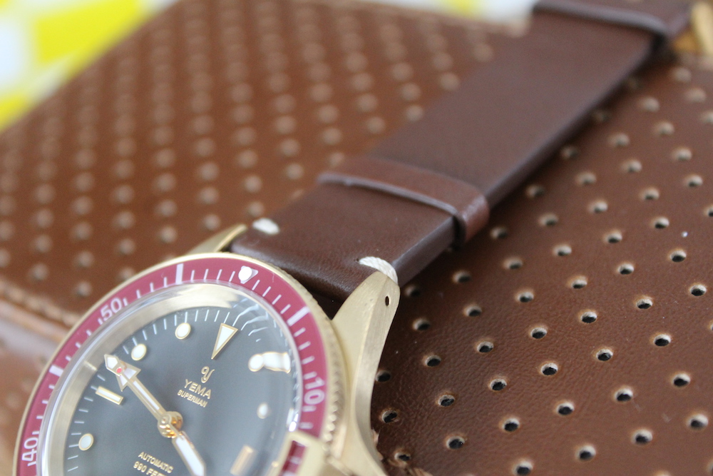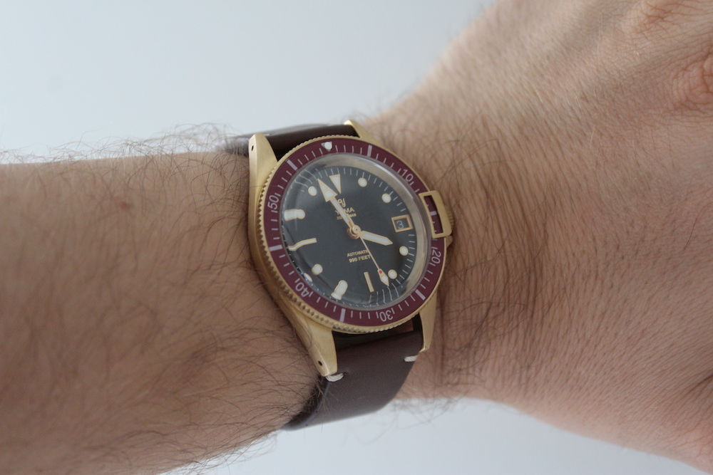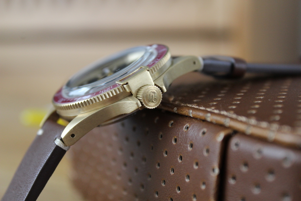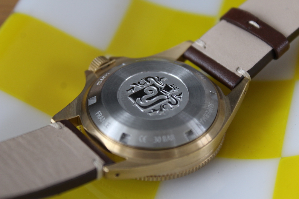 Premium watches like the Superman Bronze generally use sapphire crystal which is incredibly robust (on the Moh’s scale it rates a 9 – Diamond is 10), and will resist scratching by most substances short of diamonds. The dial really pops with this excellent watch with the dark matte black surface contrasting well with the applied hour markers featuring metal surrounds with gold finish and a slightly recessed date window. It has a brown vintage leather strap that enhances the Superman Bronze overall vintage aesthetic and perfectly fits the bronze case natural patina. We’re big fans of this watch and sure you will be too if you get your hands on one.