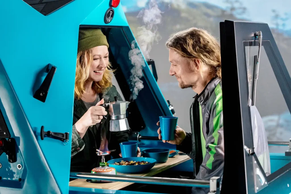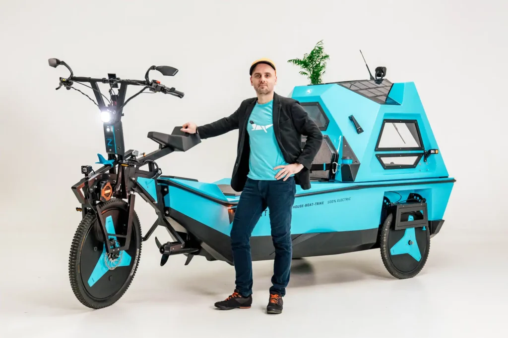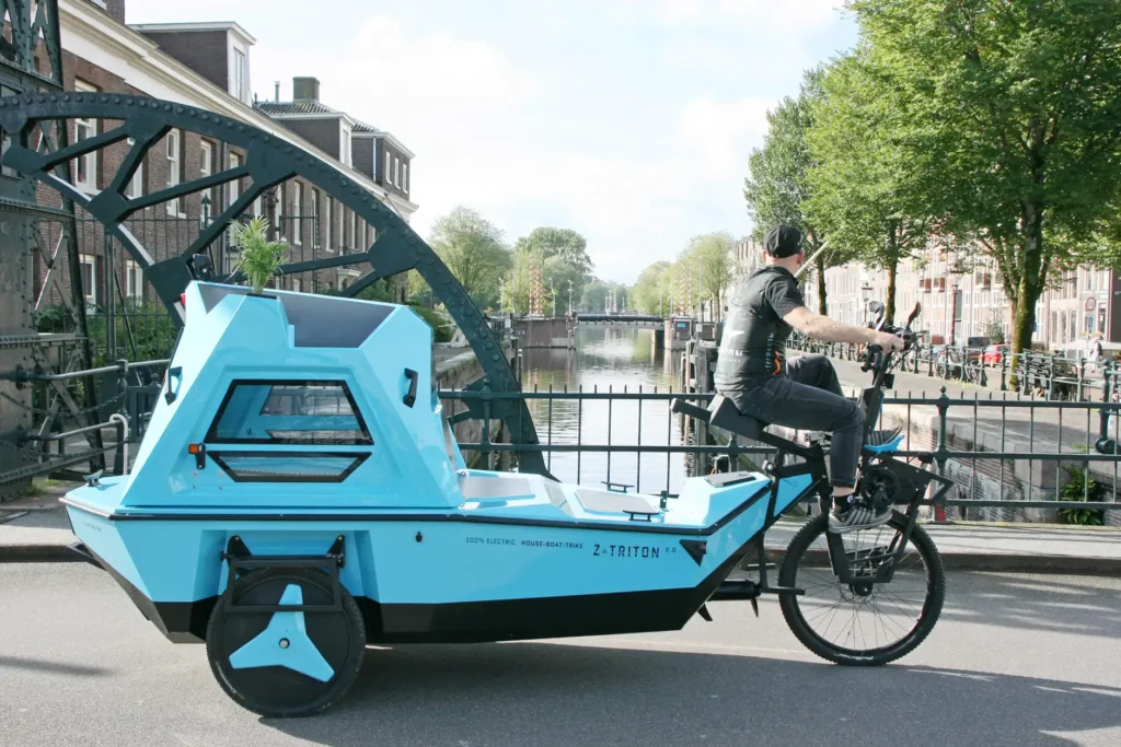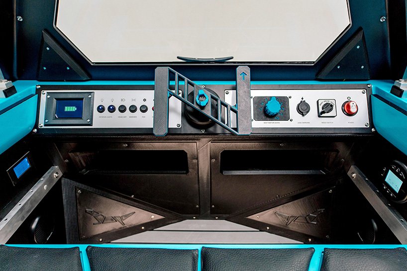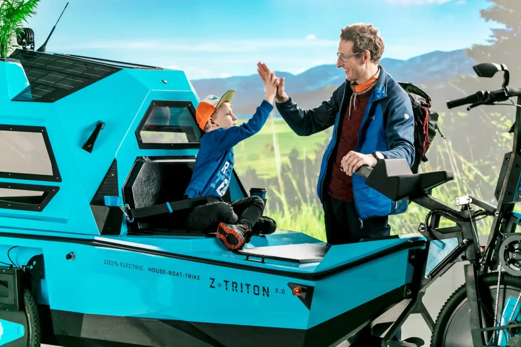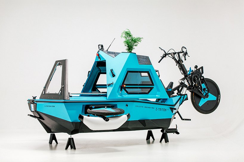 The Z-Triton Amphibious Camper Trike has twice the power of the prototype – 1000W and the boat mode is also upgraded with a stronger 1150W motor that has been integrated into the body and can be lifted up/down from the cabin itself. It is 100% electric with both boat and trike electric motors, a Li-ion battery pack, and integrated roof solar panels. The body is crafted from organic fibreglass with polyester made from recycled pet bottles and a number of parts are large-format 3d printed with bioplastics. In addition, there is a plant pot that enables users to carry small trees that can be planted along the way to reforest the planet. As such, this new Z-triton has a positive CO2 footprint and aims to be the most sustainable RV on the market.