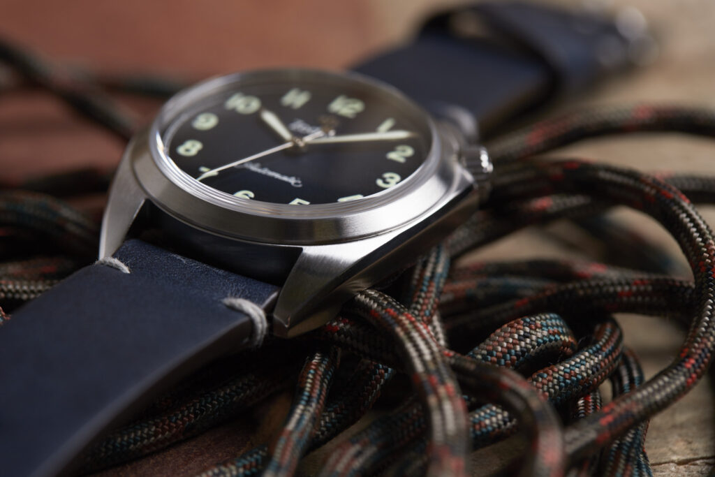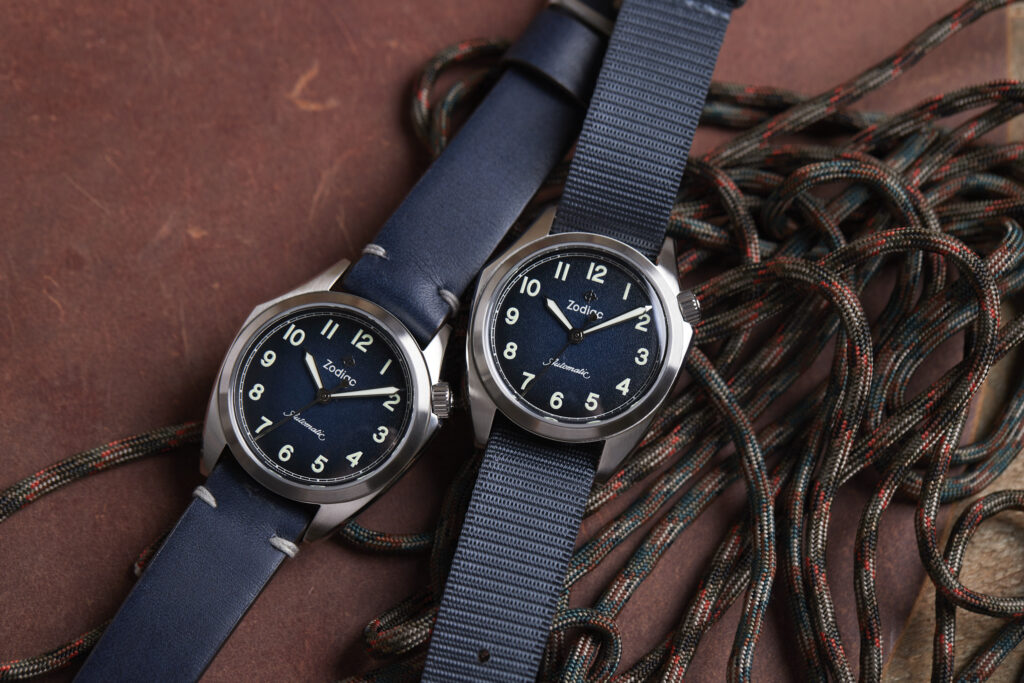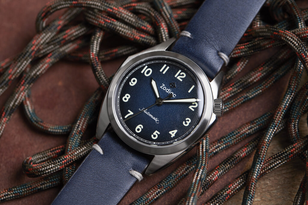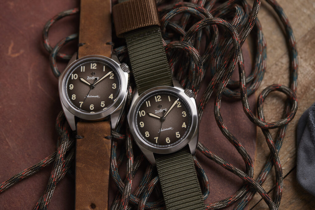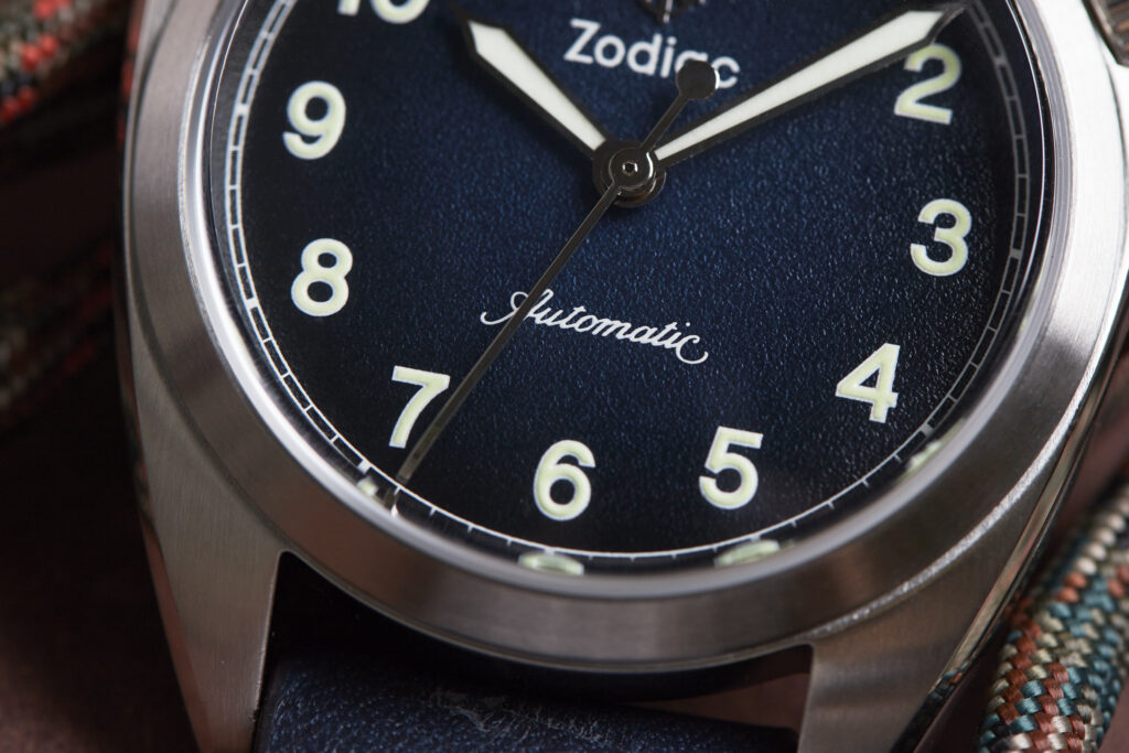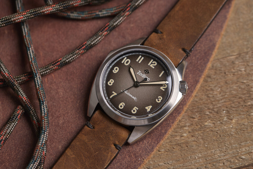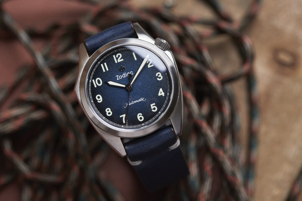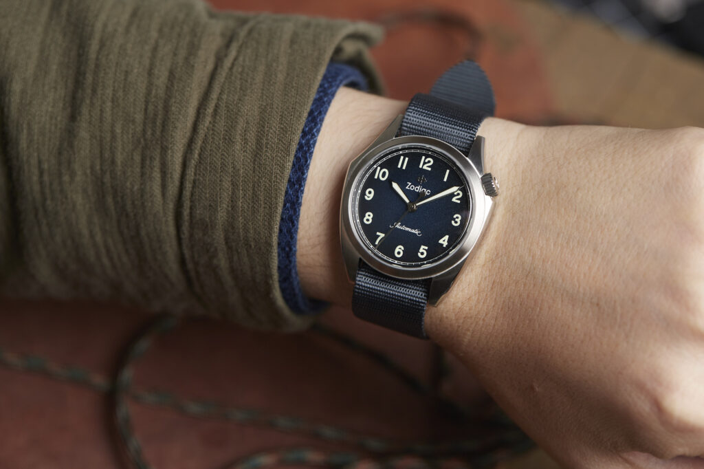 The dial of the Zodiac x Worn & Wound Olympos Military Watch ($895) is pure classic military, with a railroad minute track around bold, lumed numerals. The hands too are a true-mil style which adds to the overall legibility of the timepiece. The Worn & Wound edition, exclusive to the Windup Watch Shop, is available in two dial colors, both including two original, US-Made straps. The first is a navy blue to black gradient with green lume, which is paired with a blue leather Model 2 Premium strap, and a special Admiralty Gray ADPT single pass with a sage keeper. It’s cool, clean, and classic.