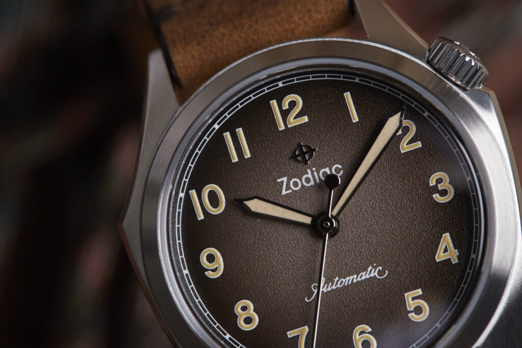 The Zodiac x Worn & Wound Olympos Military Watch ($895) is based upon a timepiece originally created back in 1961 so has a real mid century vibe to its design aesthetic. The Zodiac Olympos was a line of highly creative watches boasting a signature “manta ray” case that immediately catches the eye. Unique to Zodiac, this case design is asymmetrical across the horizontal axis of the watch, which delivers the illusion of different length lugs above and below, and moves the crown off-centre to two o’clock.